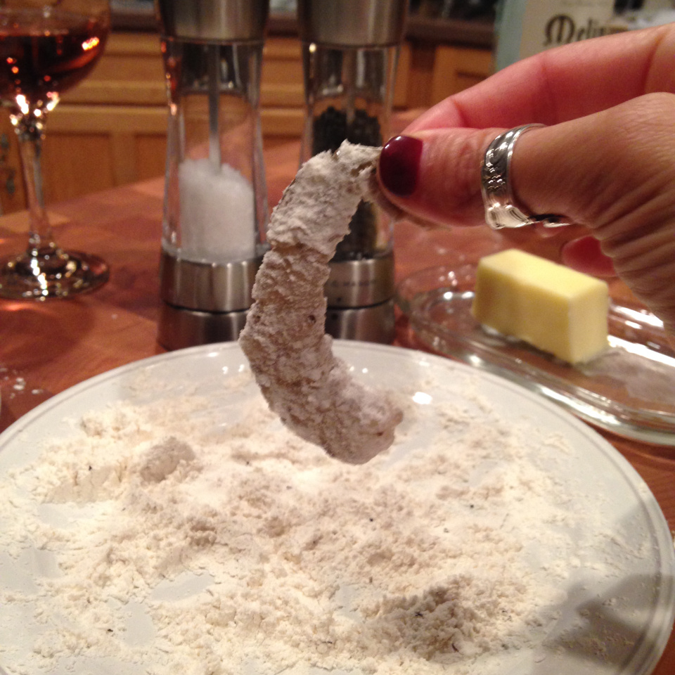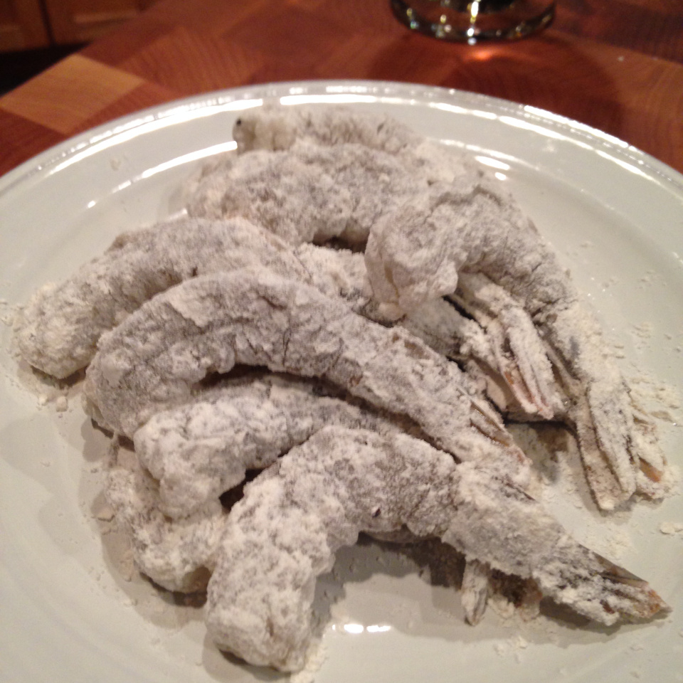 1). In a shallow bowl, stir together the flour, salt and pepper. Toss the shrimp in the flour mixture to coat evenly, shaking off the excess.